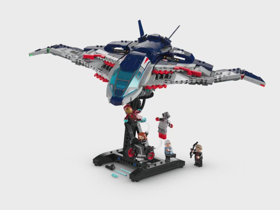 - Quinjet de los Vengadores: La aeronave está equipada con cabina abatible, 2 cañones frontales que disparan, espacio para guardar armas y compuerta trasera que se abre para cargar la moto o sacarla