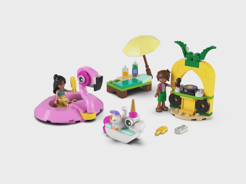 Este set de construcción proporciona infinitas oportunidades de jugar a recrear situaciones cotidianas y contar historias en la Fiesta en la Piscina con Flamenco y Unicornio LEGO® Friends (42658). El juguete, ideal para niñas y niños a partir de 5 años, incluye 2 flotadores construibles, accesorios de piscina, 2 minipersonajes LEGO Friends y una figura de un gato. Los peques expresan su creatividad contando la historia de Leo, Liann y Churro, que han organizado una divertida fiesta en la piscina con sus flotadores con forma de unicornio y flamenco. El flamenco tiene espacio para 2 personajes y cuenta con un soporte para los 2 polos. El unicornio, más pequeño, es perfecto para el gato Churro. El set contiene también una tumbona, una cabina de DJ con disco giratorio y micrófono, una sombrilla y una bebida. Descubre más juguetes socioemocionales (a la venta por separado) en el universo LEGO Friends. La intuitiva app LEGO Builder que viene con este set ayuda a construirlo con facilidad.