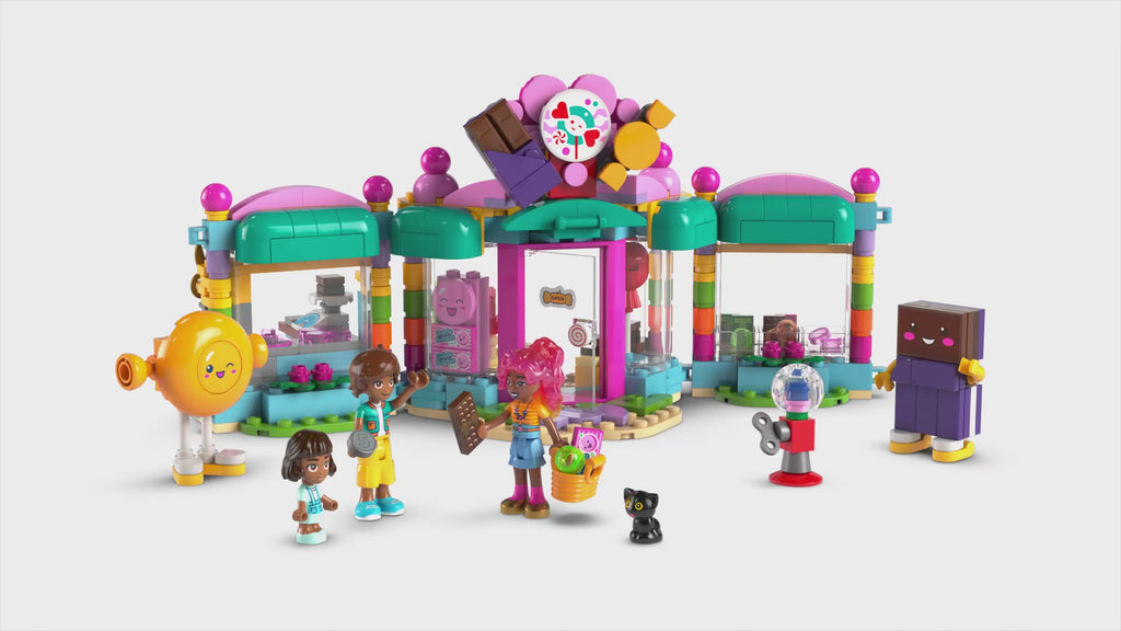 - Set infantil lleno de imaginación para recrear situaciones cotidianas: Set de juego simbólico Tienda de Dulces de Heartlake City para niñas y niños a partir de 6 años, con 2 minipersonajes, un micropersonaje, una figura de un gato y accesorios