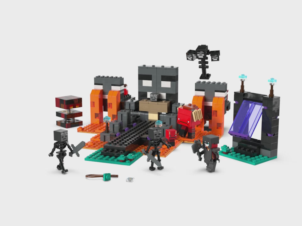 Repleto de acción y detalles al estilo Minecraft, este set incluye un Guerrero Carmesí, 2 esqueletos de Wither, un Caminante, un cubo de magma y un jefe Wither. Un portal del Nether y un santuario con una mesa de trabajo y un Wither oculto que los niños pueden invocar con una función de explosión harán que el juego cobre vida. La oportunidad de disfrutar jugando a pelear contra enemigos, montando en el Caminante y participando en épicas aventuras convierte el set en un padrísimo regalo para jugadores de Minecraft y constructores LEGO. Invita a otros a divertirse construyendo con el modo Construye en Compañía de la app LEGO Builder. Contiene 494 piezas.