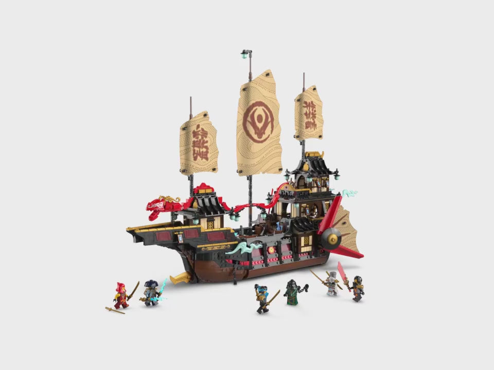 - Juego interactivo con un barco: Los fans de NINJAGO® girarán un mecanismo para mover las velas, quitarán los techos y los suelos para acceder al interior y a un bar de sushi, y plegarán la mesa del camarote principal para revelar un secreto