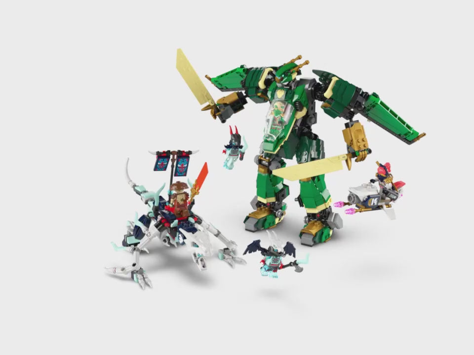 El set de construcción de juguetes ninja Meca Reactor de Lloyd (71845) para niños y niñas a partir de 9 años les permite disfrutar de aventuras y batallas ninja por tierra y aire mientras recrean emocionantes escenas de la temporada 3 de NINJAGO®: El Renacer de los Dragones. Los peques interpretan la acción con el imponente meca de este set de combate, que cuenta con patas y brazos articulados, cabina y 2 grandes espadas. Luego reorganizarán sus piezas para crear un alucinante reactor con cabina, alas y motores a reacción. Este set incluye 5 minifiguras: Sora y Lloyd, con armas ninja para enfrentarse al infame trío formado por Kur, Tyr y un guerrero Dragónido Espectral, que portan un estandarte con un mensaje secreto que solo puede leerse usando la espada reveladora translúcida. Sora pilota una moto voladora y los villanos tienen un dragón espectral articulado, cuyas piezas se pueden intercambiar con las del juego Dragón del Caos: Colmillo Tronador (71832) (a la venta por separado).